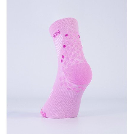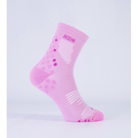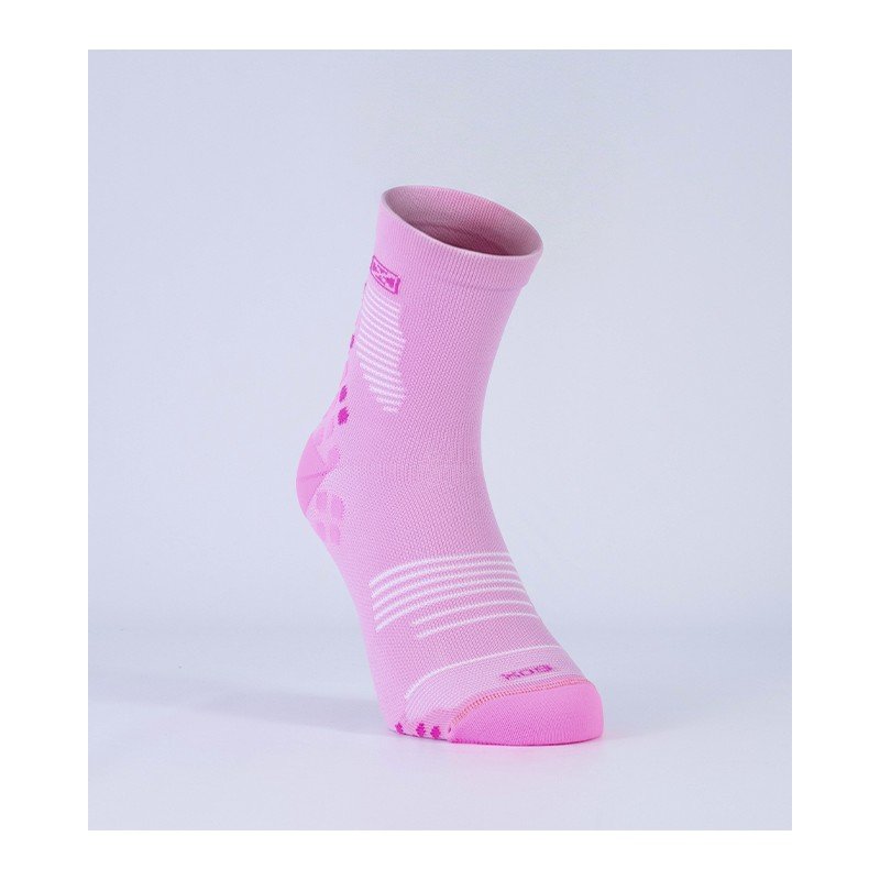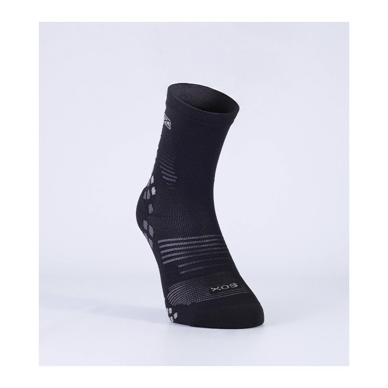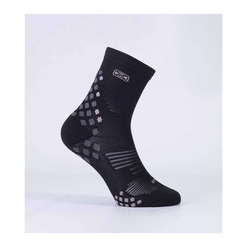 Medias de compresión pensadas para el deportista. Desarrolladas para contribuir a la re-circulación del sistema sanguíneo y a la contención de los músculos. Colaboran en la prevención de la fascitis plantar por la compresión transmetatarsal. Puño doble elastizado, caña y pie anatómicos, sectores específicos de ventilación para evitar el calentamiento del pie, puntos de apoyo sectorizados con mayor densidad para absorber impactos. Talón y puntera reforzados, costura de puntera extra plana, secado rápido gracias a su composición.